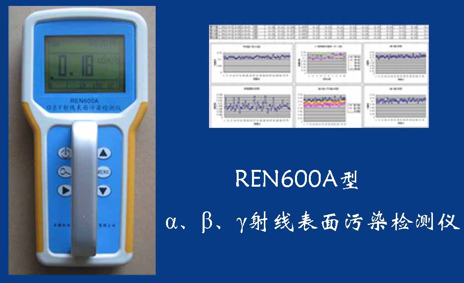 REN600A 表面沾污檢測儀REN600A型α、β、γ射線表面污染檢測儀即可檢測α、β、γ射線,也能檢測到X射線,它采用高速嵌入式微處器作為數(shù)據(jù)處理單元,點陣式大屏幕LCD液晶顯示,讀數(shù)清晰、操作方便,具有400條超大容量數(shù)據(jù)存儲。儀器采用進口的大面積MICA蓋革探測器,具有較高探測效率,可進行α、β輻射表面污染檢測和X、γ輻射劑量率的監(jiān)測。此外通過配套的RenriCont表面污染管理軟件可將存儲的數(shù)據(jù)讀出后分析。可廣泛用在制藥廠、實驗室、發(fā)電廠、進出口商檢、采石場、環(huán)境實驗室、環(huán)境污染調(diào)查、核安全應(yīng)急、緊急狀況營救站、金屬處理廠、地下油田、供油管道裝備、醫(yī)院核醫(yī)學(xué)科、同位素實驗室、環(huán)境保護和警察局等部門。REN600A型α、β、γ射線表面